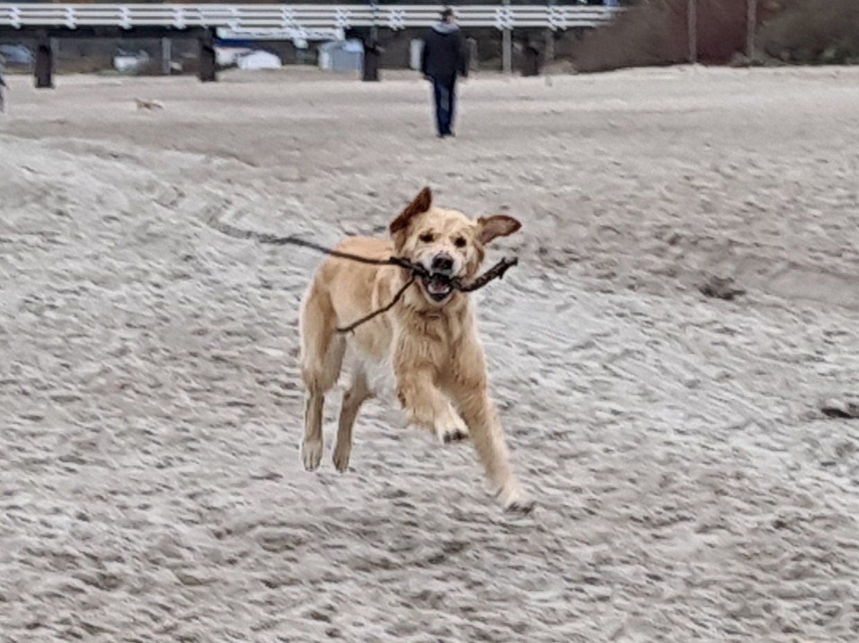 Die 3 Jahre und 3 Monate alte Golden Hündin ist freundlich und aufgeschlossen gegenüber Menschen, sie spielt gerne und hat eine hohe Motivation beim Apportieren, sie läuft neugierig und sicher durch den Parcours.