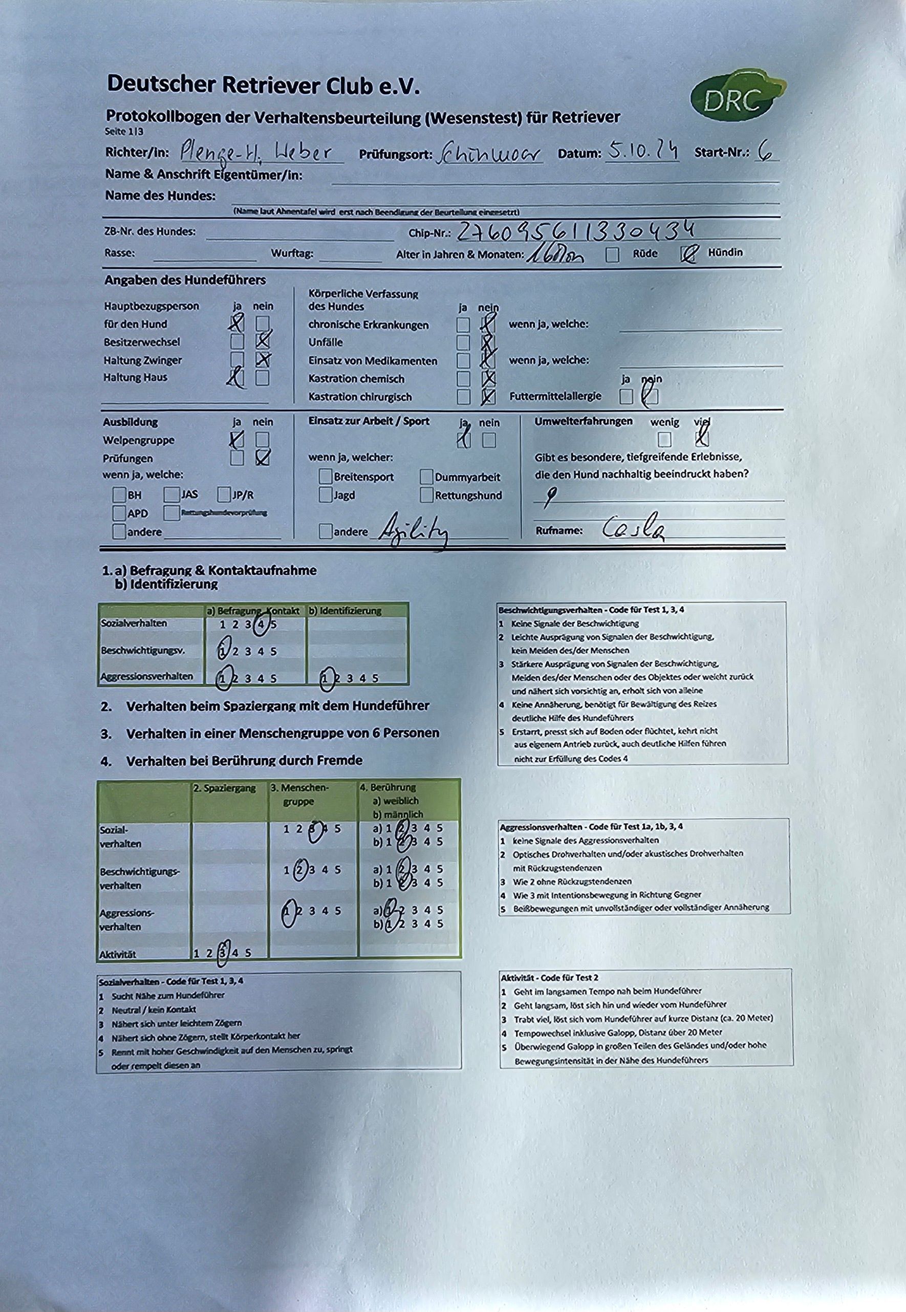 Die 16 Monate alte Hündin zeigt sich ausgeglichen, im Umgang mit Menschen freundlich und unterordungsbereit. Den Parcour mit den optischen und akustischen Reizen schaut sie sich interessiert an.
